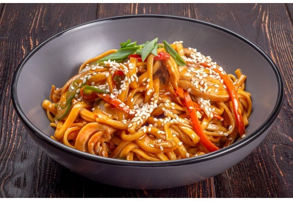-Теплый салат со свининой барбекю и кунжутным соусом