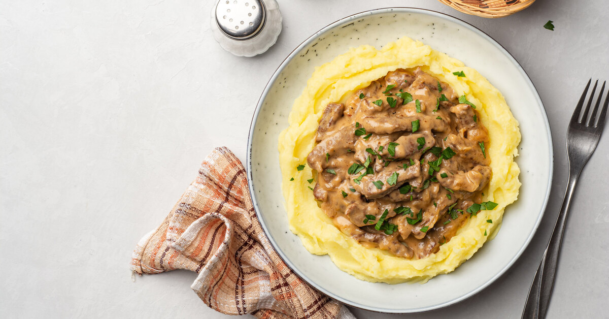 -Говядина по строгановски с мятым картофелем и солеными огурцами